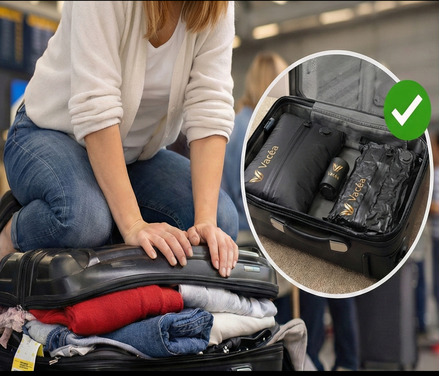 Arrêtez de choisir quels vêtements laisser derrière vous. Avec Vacea, créez jusqu’à 60 % d’espace en plus dans la même valise. Placez simplement vos vêtements dans le sac hermétique, fermez-le, puis laissez la micro-pompe USB-C retirer l’air en quelques secondes. La compression puissante aplatit les articles volumineux pour qu’ils prennent beaucoup moins de place. Pas besoin d’une plus grande valise — juste un rangement plus intelligent et plus d’espace pour l’essentiel.